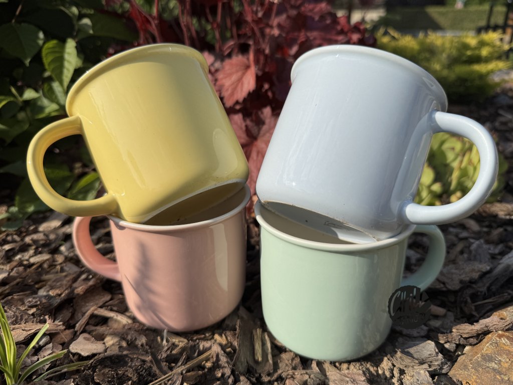 Větší hrnky na kávu, nebo čaj v pastelových barvách mají nejen krásný povrch a barvy, ale také elegantní rozšířený okraj.